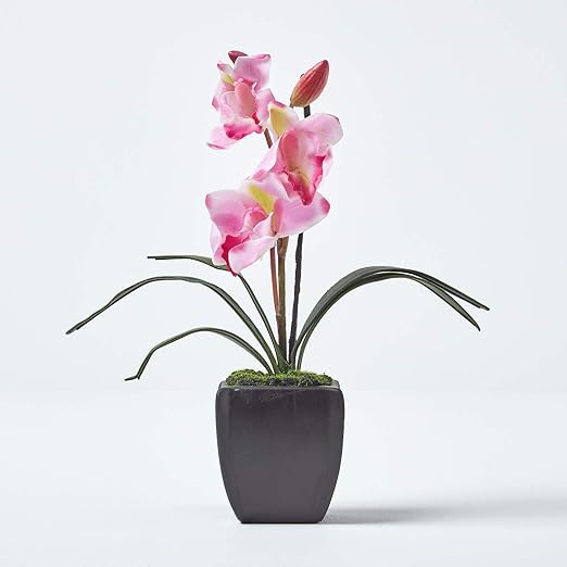 Homescapes Small Light Pink Artificial Orchid With Lifelike Silk Flowers Long Green Leaves Pastel Pink Oriental Cymbidium Flower In Small Black Mat Planter Square Pot 32cm Tall For Indoor Decoration Amazon Co Uk